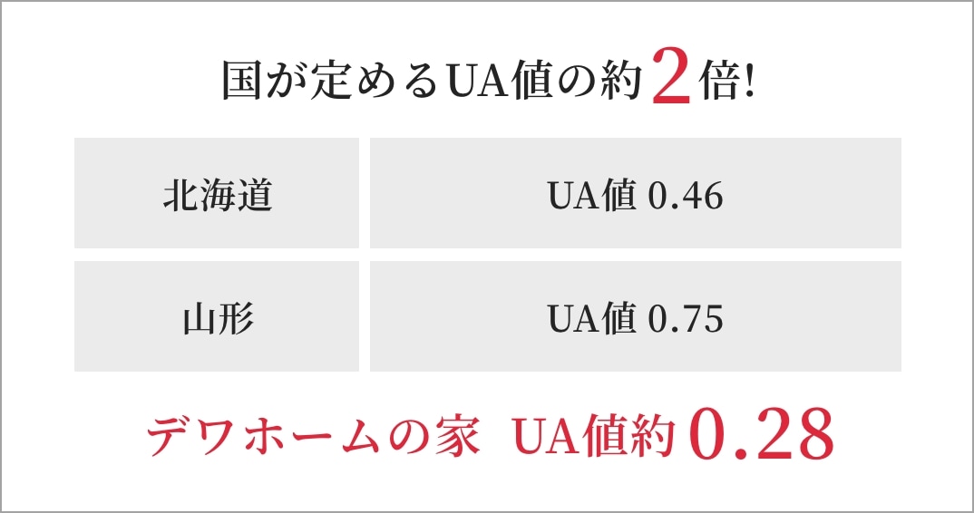 デワホームの家は、外皮(住宅の壁や屋根など)から住宅の熱が、どのくらい逃げやすいかの数値(UA値)で、国が定める各地域の省エネ基準値の約2倍の0.28を実現。高い断熱性能で、健康、快適、経済的を同時に叶えます。