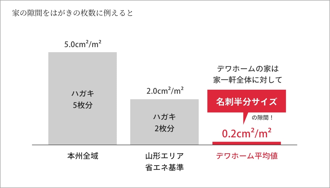 デワホームの家の隙間はたったの名刺の半分サイズだけ!高い気密性で気密測定技能従事事務所に認定された公的な第三者機関によって厳しく全棟気密測定を行っております。お客様に安心してお住まいいただくため、デワホームのこだわりのひとつです。