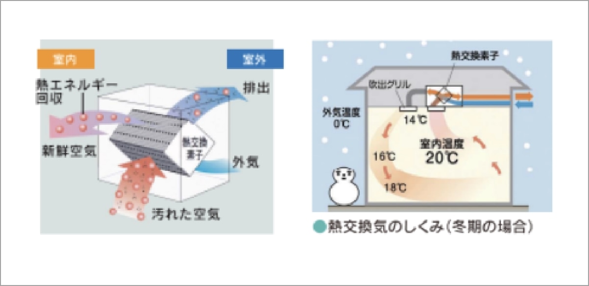 熱交換気は、排気の際に汚れた空気と一緒に捨てていた熱を給気時に回収して室内に戻します。熱回収により空調負荷を軽減でき、冷暖房コストを抑えます。また、冬期では冷たい外気を室温に近づけて給気するので、冷たい空気が侵入する不快感を防ぎます。