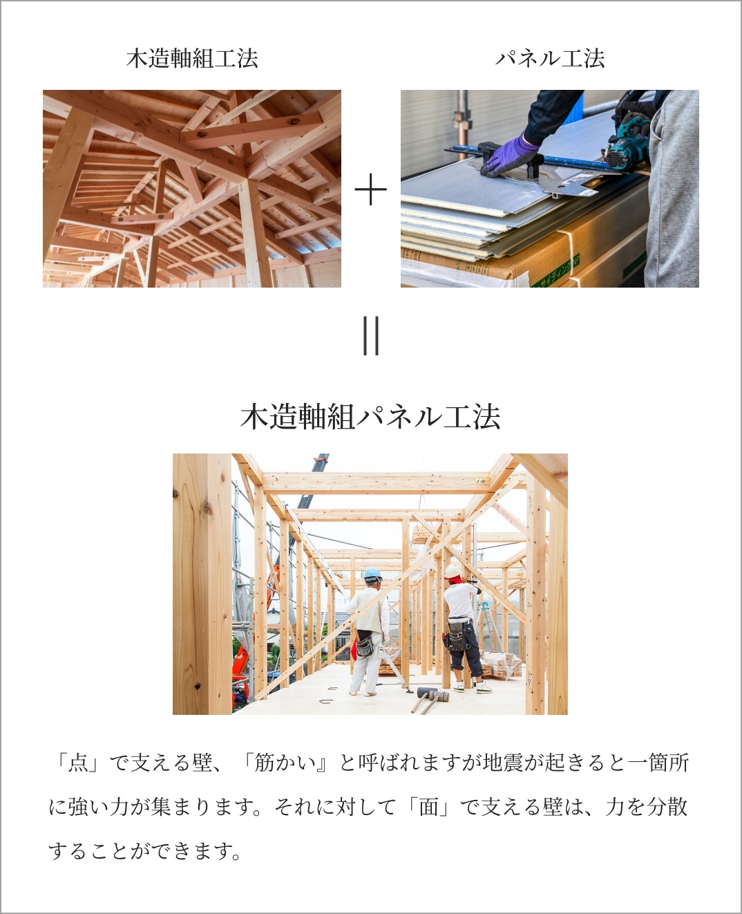 デワホームでは木造軸組パネル工法を採用。木造軸組工法に従来の筋交いを施すだけでなく、土台と柱、そして梁を一枚の耐力面材で結合します。地震の強い力を分散し、より優れた耐震性を実現しています。