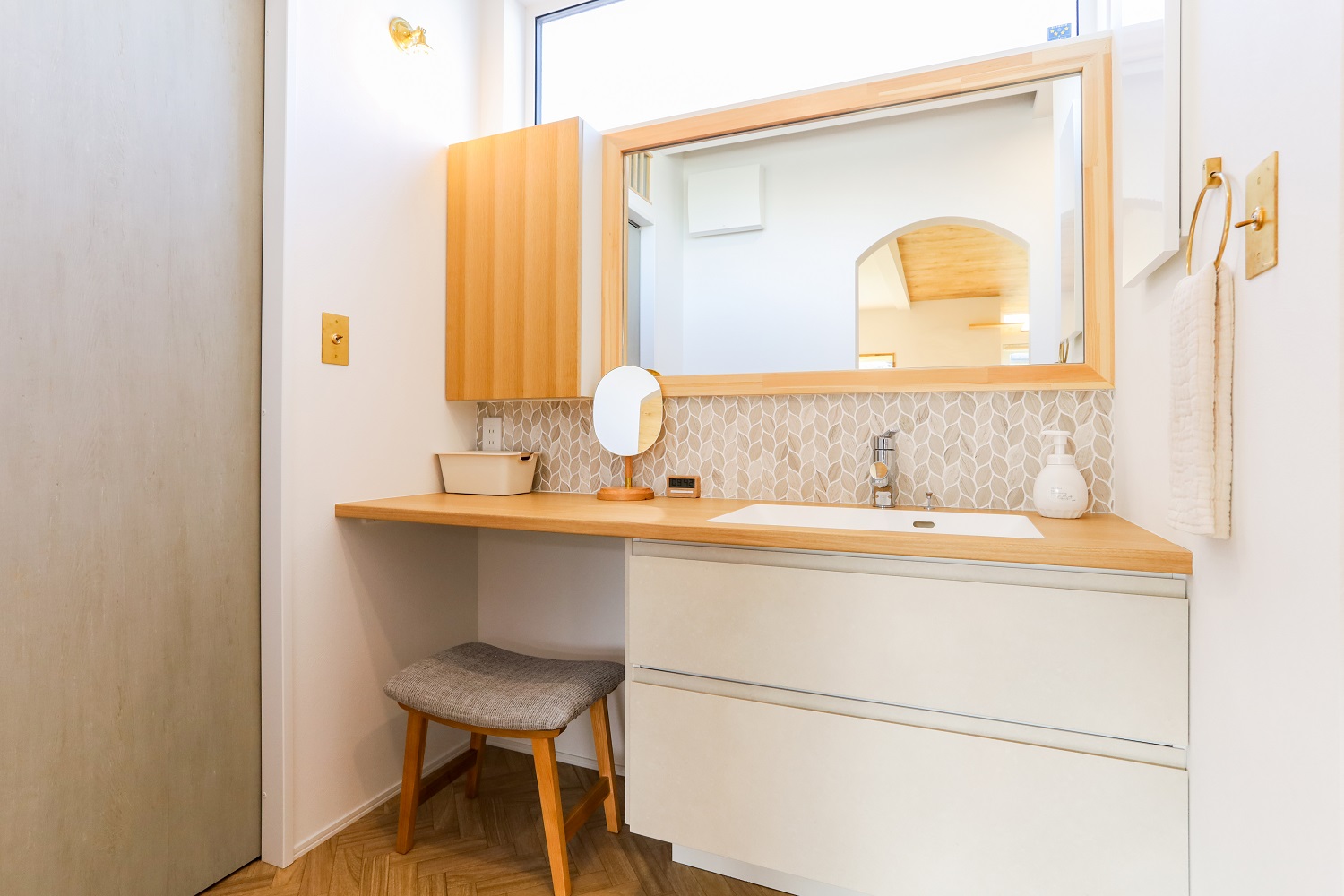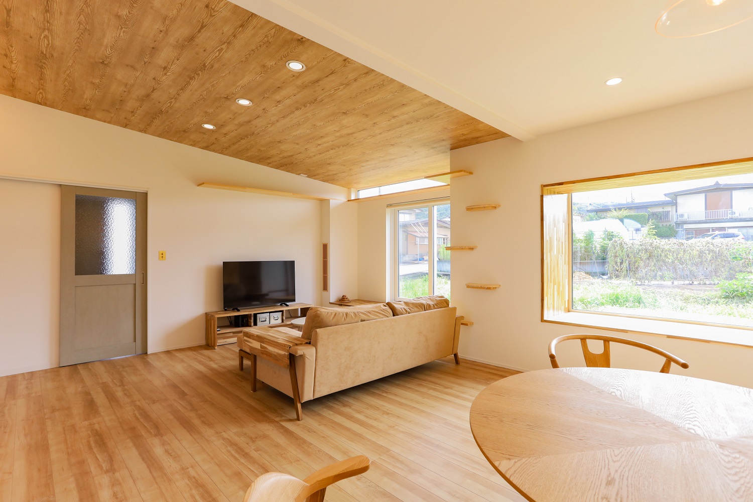 人気の平屋の仕様で建築されたA様。愛猫との暮らしを第一に考え、窓辺には人と猫が一緒にくつろげるベンチカウンターとキャットウォークを造作しました。全館空調搭載なので、電気代を抑えながらお留守番のときでも快適な室温を保つことができ安心です。アーチの下がり壁やトグルスイッチ、ペンダントライトなど細かな部分にもこだわりが光る仕上がり。