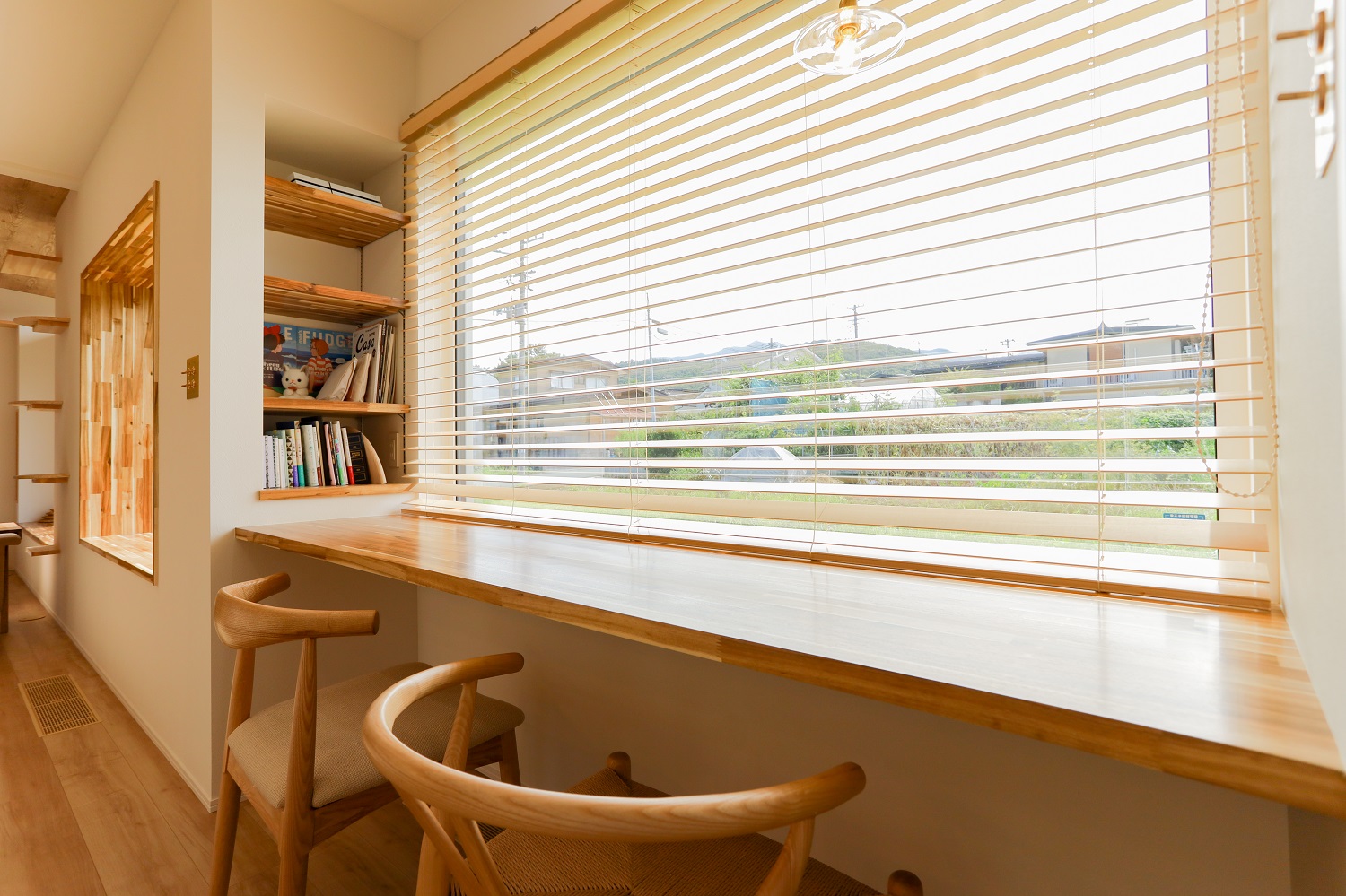 人気の平屋の仕様で建築されたA様。愛猫との暮らしを第一に考え、窓辺には人と猫が一緒にくつろげるベンチカウンターとキャットウォークを造作しました。全館空調搭載なので、電気代を抑えながらお留守番のときでも快適な室温を保つことができ安心です。アーチの下がり壁やトグルスイッチ、ペンダントライトなど細かな部分にもこだわりが光る仕上がり。