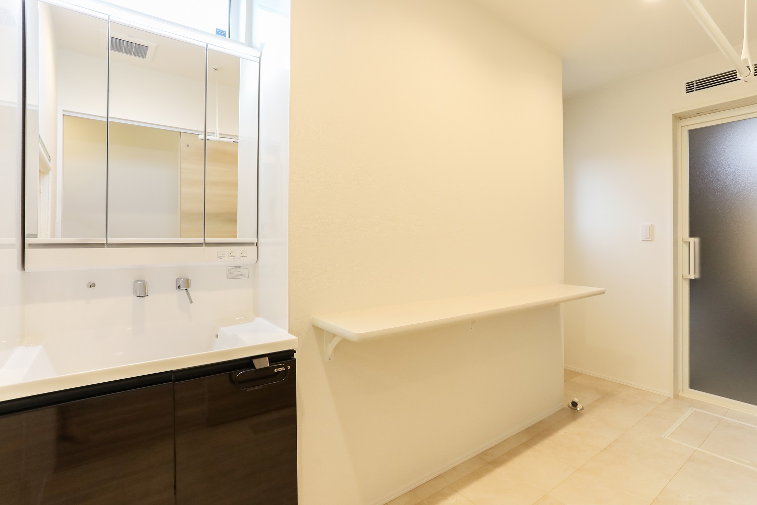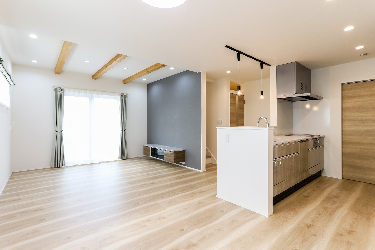 幅が広めのフローリングがゆったりと落ち着いた印象を形作るインテリア。玄関からシューズクロークを通ってすぐにキッチンにアクセスでき、お買い物から帰ってきた後の家事ラク動線を確保しています。家族の会話が生まれやすいリビング階段ですが、暖気が2階に逃げず1階が快適なままなのは全館空調ならでは。