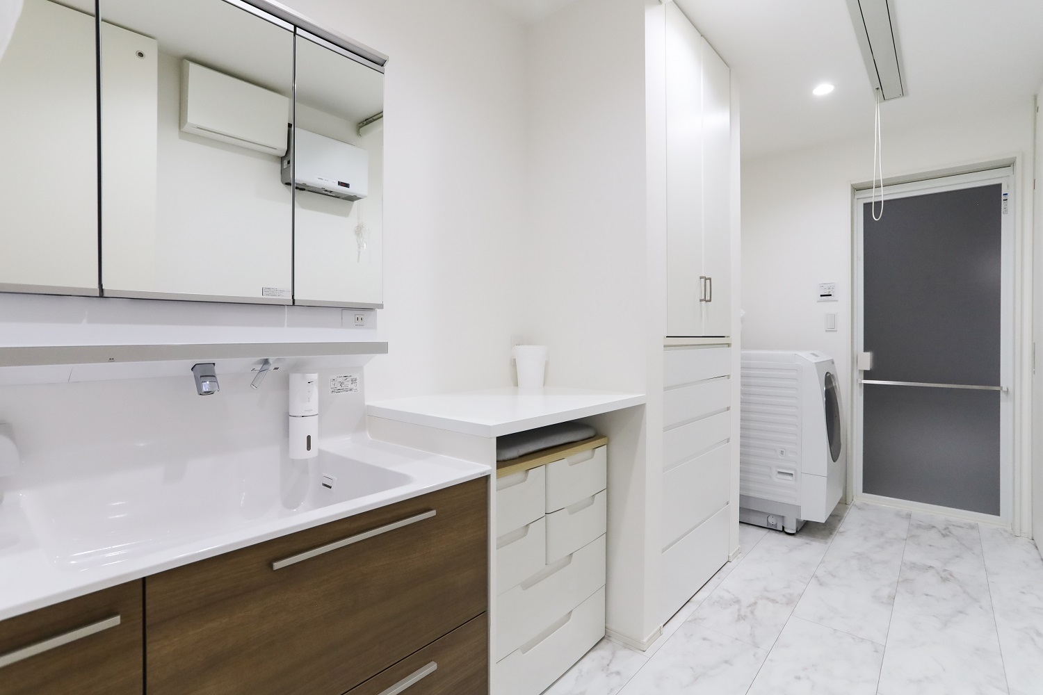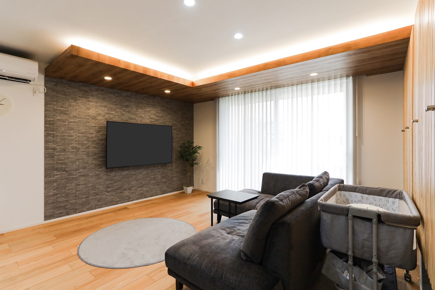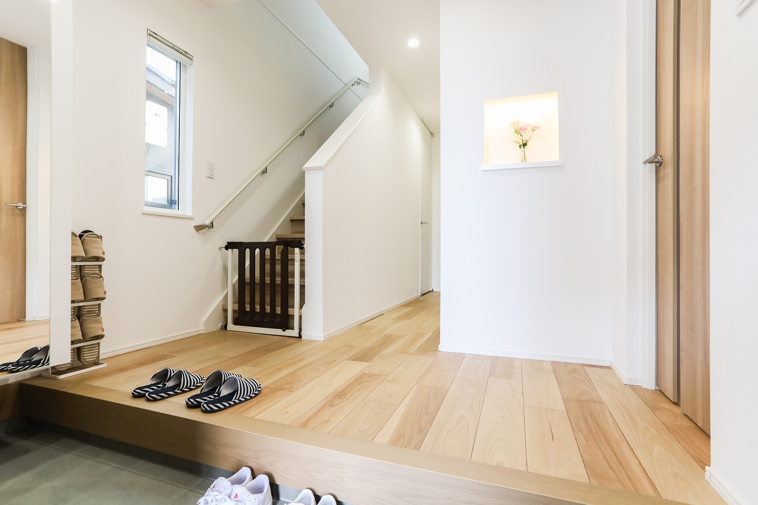 格子やフローリング、アクセントクロスの木目が印象的な内装。家具・設備機器のモノトーンとの組み合わせがスタイリッシュな和モダンテイストを演出しています。玄関-キッチン-水回りは回遊でき、毎日の家事の効率アップのために共働きのオーナー様ご夫婦がこだわったポイントです。