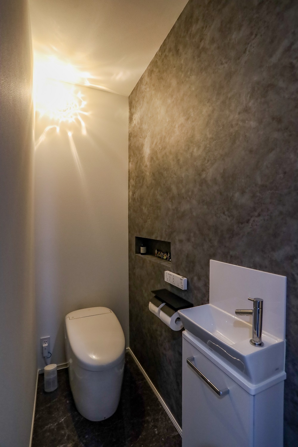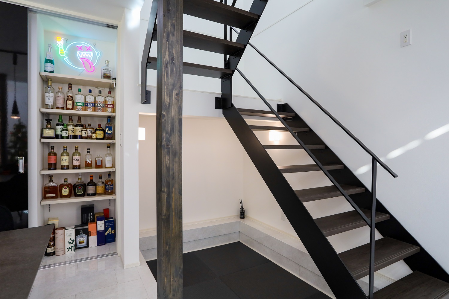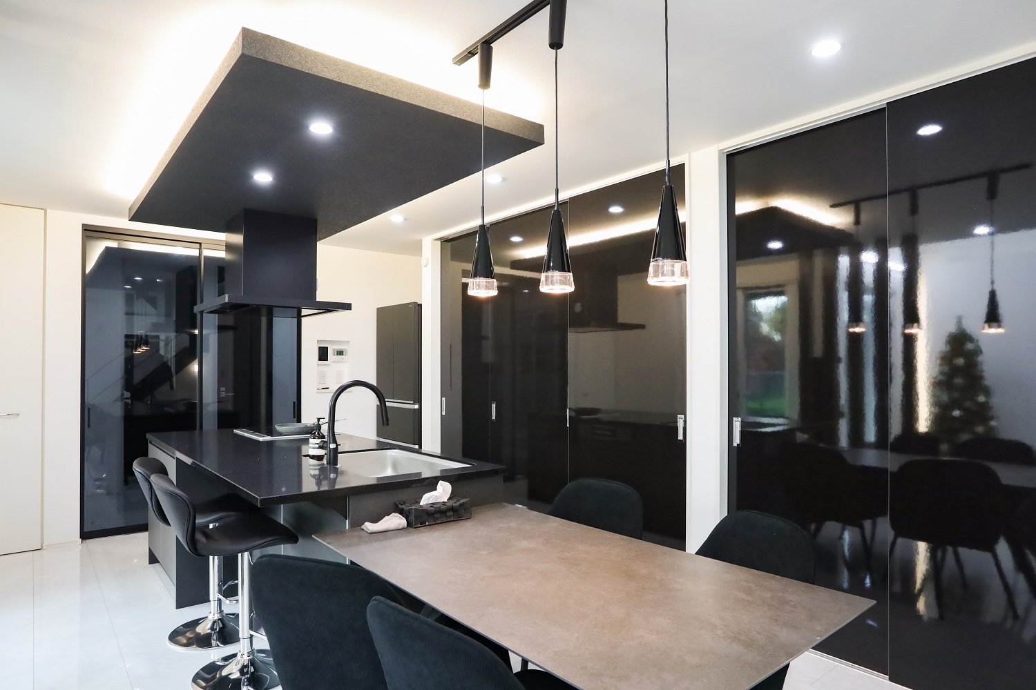 モノトーンで統一した重厚的なシンプルモダンインテリア。大理石調のフローリングの光沢感やリビングの間接照明とのコントラストによって非日常的でラグジュアリーな空間を演出しています。収納もたっぷりで実用性や暮らしやすさも◎