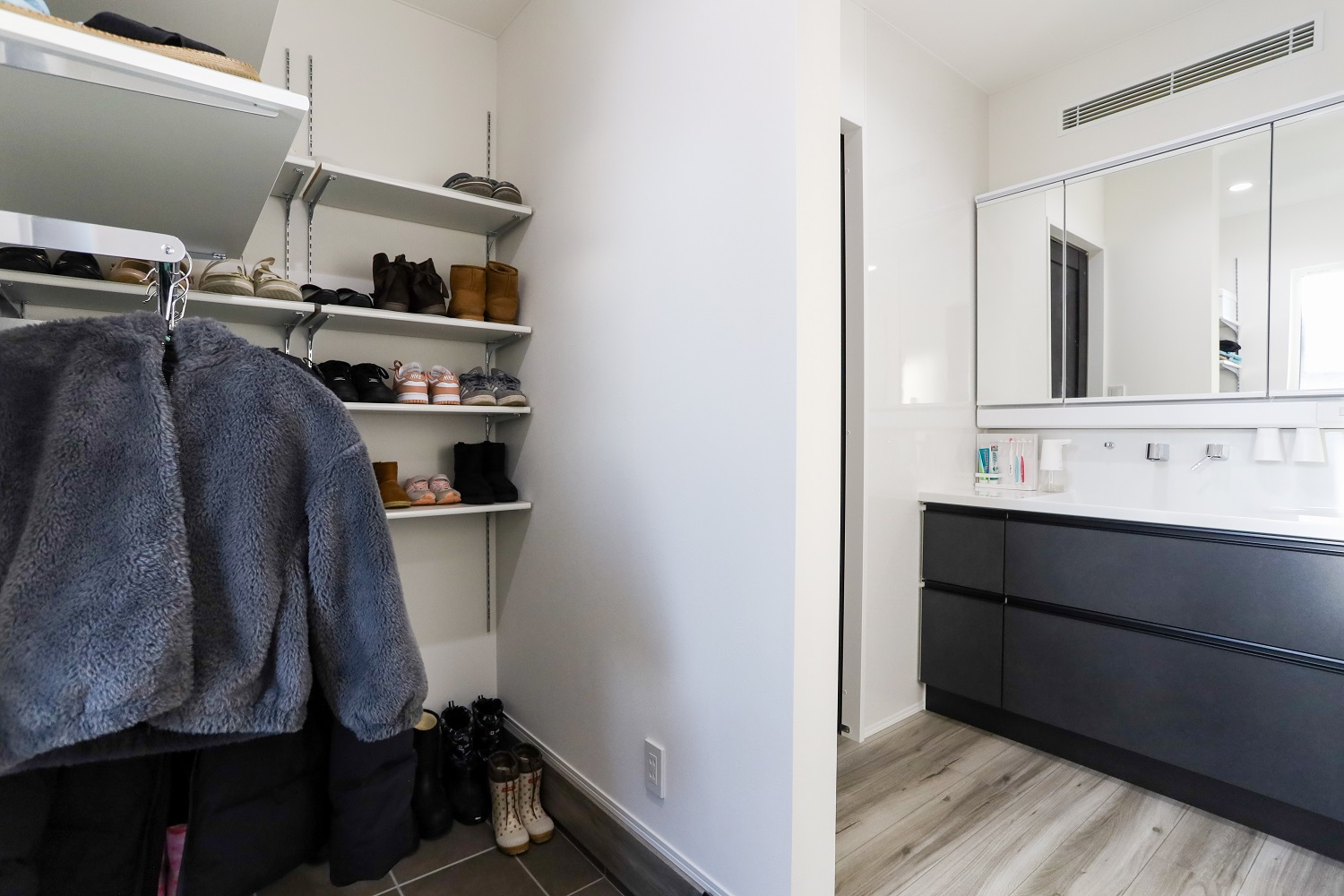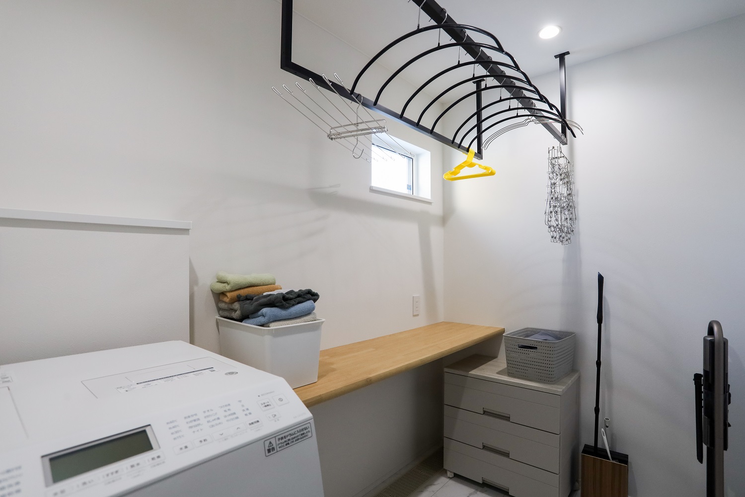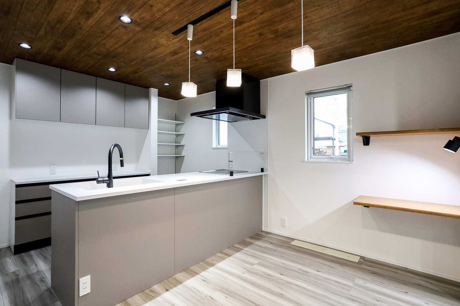 19畳の広々LDKは木目のクロスを貼ったキッチン上の折下げ天井が印象的。グレーを基調とした空間にアイアンやダークブラウンの木目のテイストがアクセントになっています。オープンキッチンや階段のオープン手すりも開放的な空間づくりのポイントです。