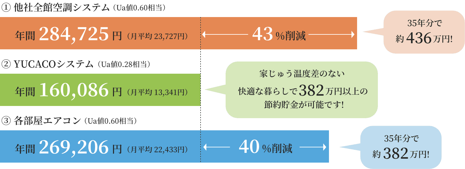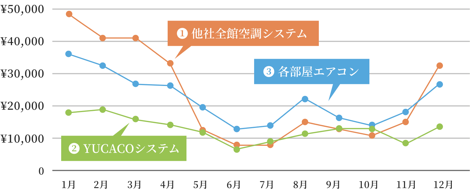 通常の住宅では居室ごとに冷暖房が必要ですが、YUCACOでは建物全体が守られるため、家中の温度を一定に保てます。