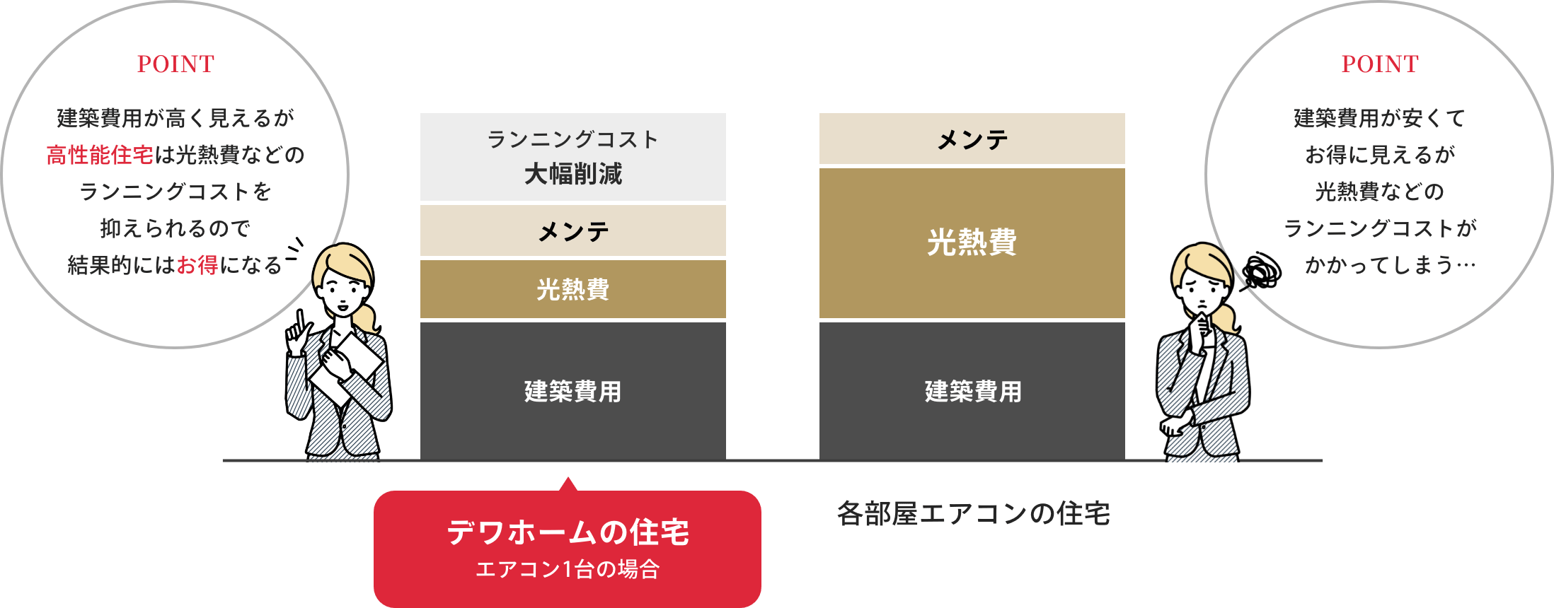 デワホームの低燃費住宅は、修繕費や光熱費などのランニングコストも抑え、次世代に住み継げる住まいを実現。