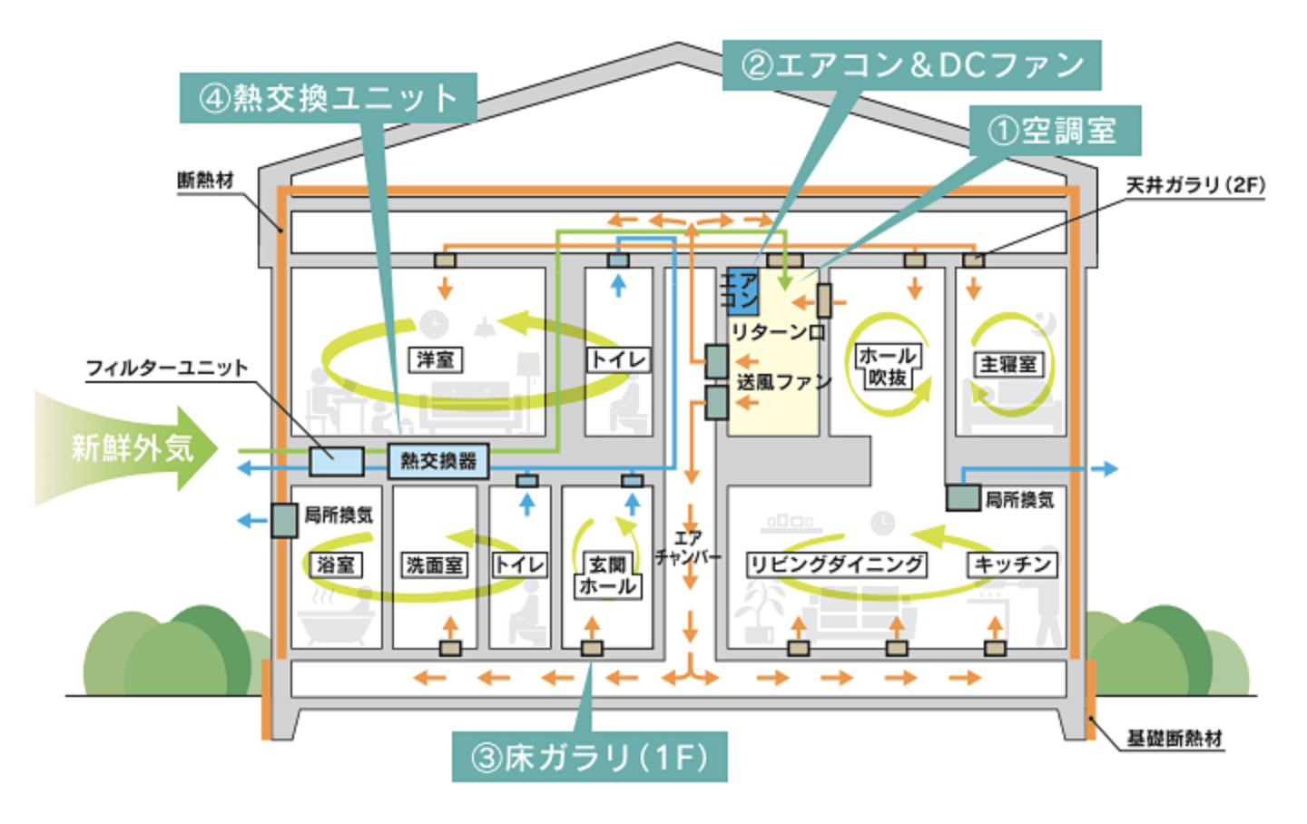 空調室にはエアコン1台を配備し、DCファンで各部屋に新鮮な空気を送風。大風量で温度差の少ない快適空間をつくります。