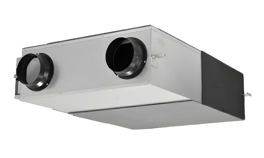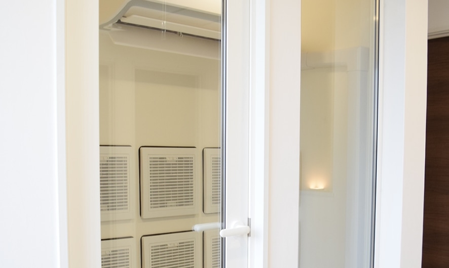 新鮮な外気は、PM2.5(97%)まで除去するフィルターを通して空調室に導入され、室内の循環空気と混合、エアコンで調温された後、各部屋に換気グリルから給気されます。